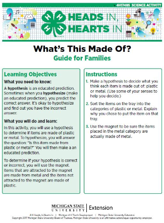 Heads In, Hearts In: A Delivery Approach to Family Enrichment Programming – Science Activities are designed to help Michigan State University Extension staff members to involve partners in facilitating a family enrichment program around the topic of science education. Family enrichment programming is an approach to education that involves youth and their families learning together as they focus on a topic. This page includes the full science activity book containing all 33 science activities, the staff guide for tips for facilitating a family enrichment event and all 33 science activities available for download individually.