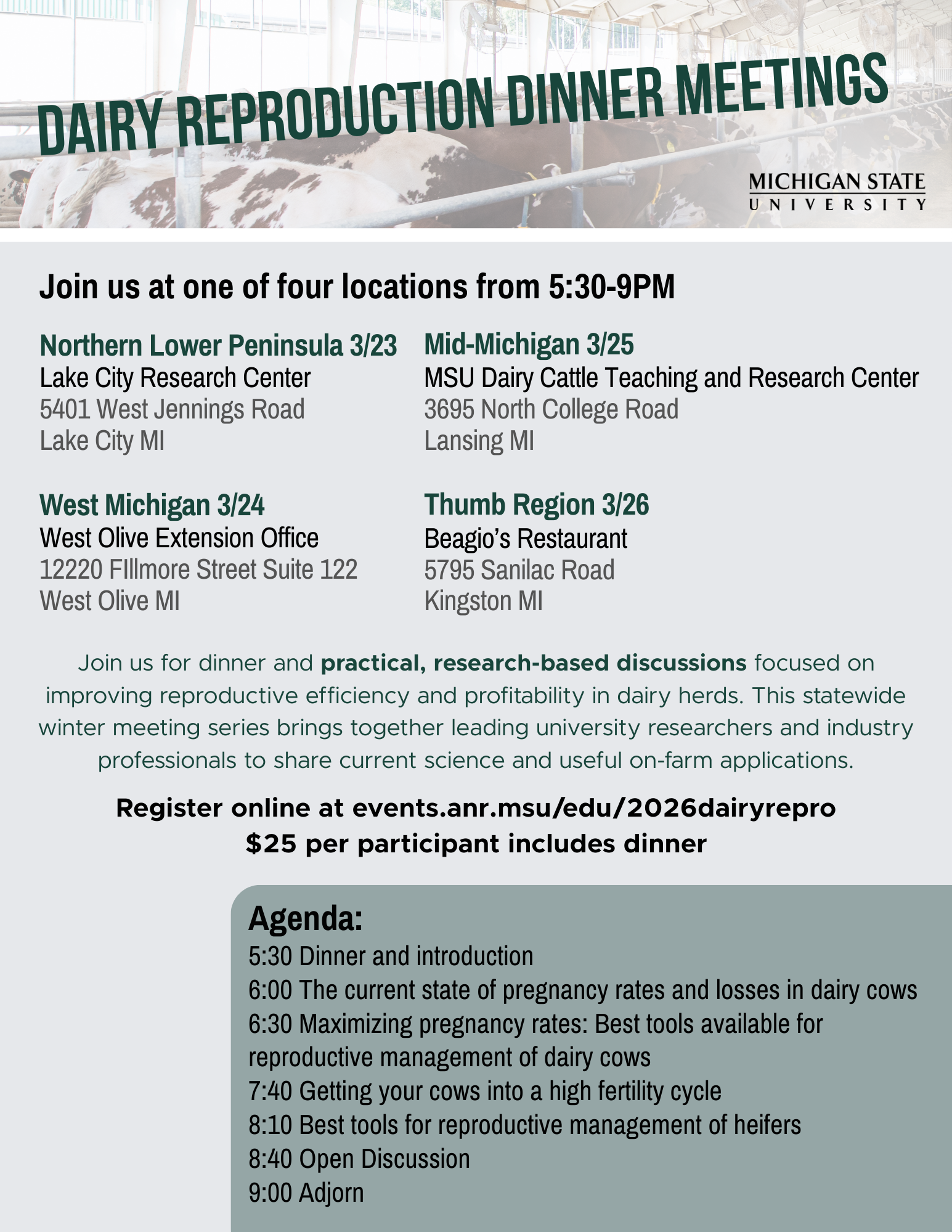 This statewide winter meeting series brings together leading university researchers and industry professionals to share current science and on-farm applications. Gain practical, science-based insights into dairy reproduction, learn strategies to improve pregnancy rates and herd profitability, and stay current with advances in reproductive management.