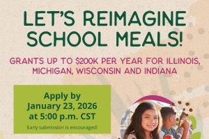 The Lake Michigan School Food System Innovation Hub supports people working to improve school meals across Illinois, Indiana, Michigan, and Wisconsin. Two grant opportunities are available for up to $200,000 per year. Apply by January 23, 2026. -