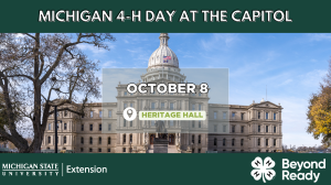 On Wednesday, October 8, MSU Extension will host the third annual Michigan 4-H Day at the Capitol. This event showcases the positive impact of the Michigan 4-H program and brings visibility to its efforts throughout the state. -