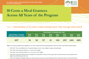 Every year, the Michigan Department of Education submits a report to the state legislature about 10 Cents a Meal, to which 10 Cents a Meal partners contribute. This report shares information about the impacts of the 10 Cents a Meal program in 2023-2024. -