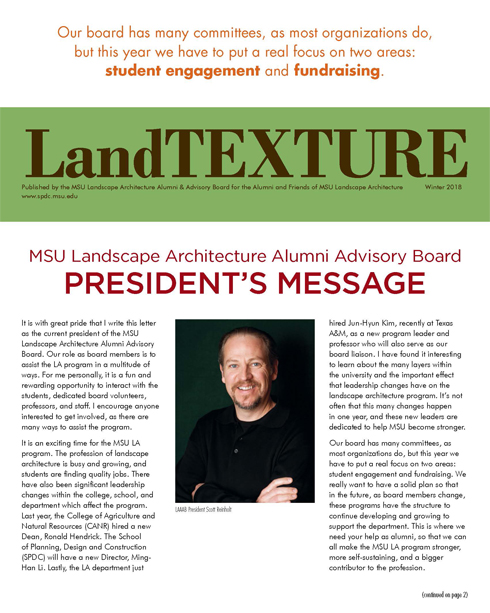 It is with great pride that I write this letter as the current president of the MSU Landscape Architecture Alumni Advisory Board. Our role as board members is to assist the LA program in a multitude of ways.