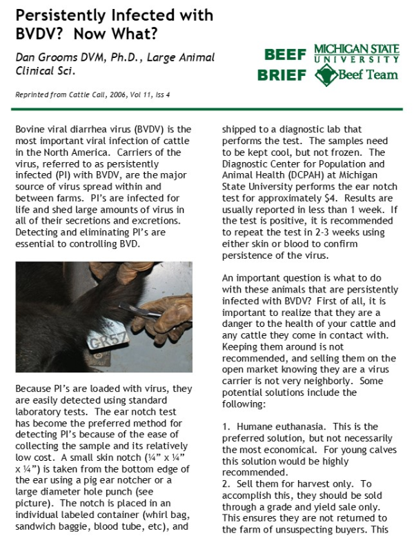 Bovine viral diarrhea virus (BVDV) is the most important viral infection of cattle in North America. Carriers of the virus, referred to as persistently infected (PI) with BVDV, are the major source of virus spread within and between farms.